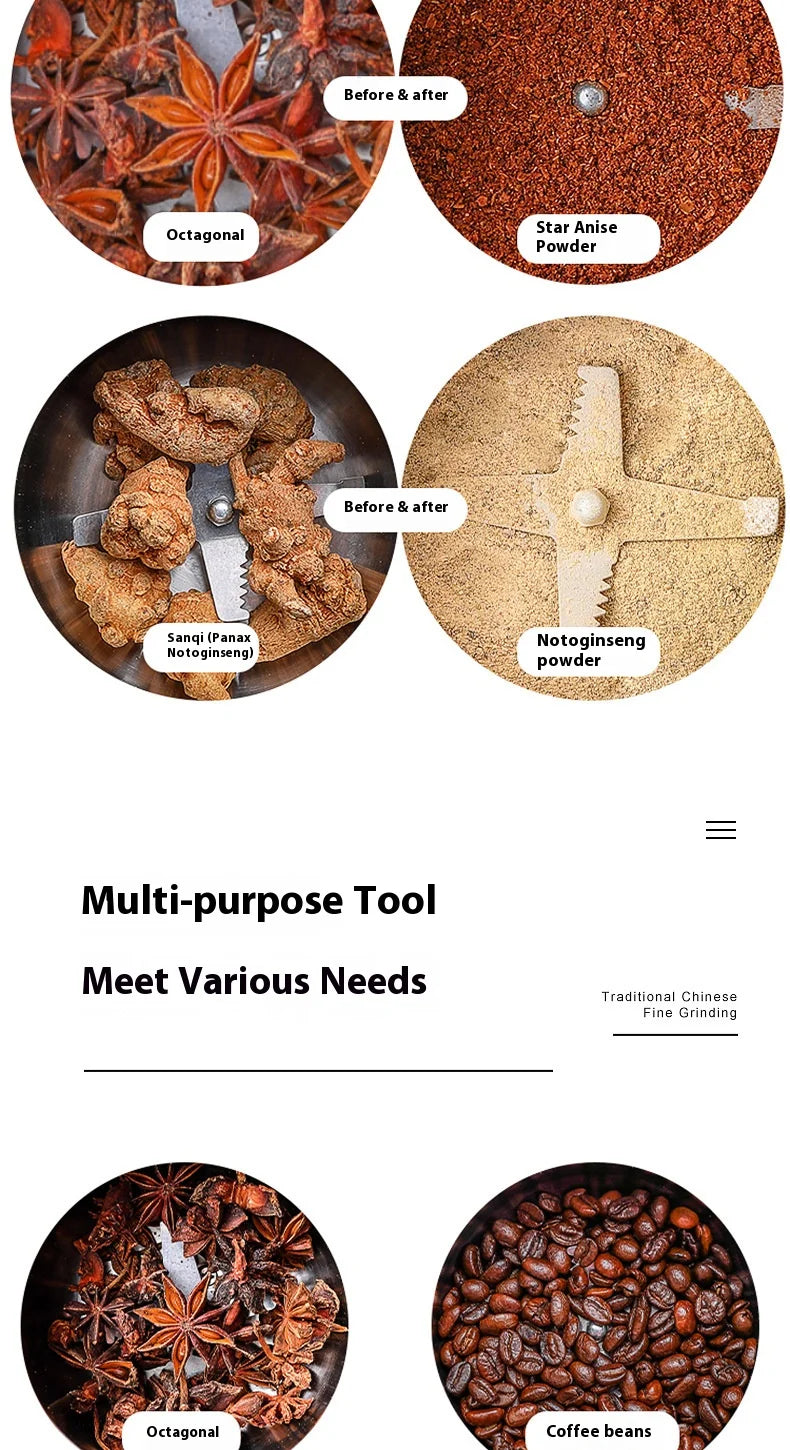 This electric grinder uses eight sharp stainless steel blades powered by a high-speed 400W motor to rapidly smash and blend grains, beans, herbs, and spices. Simply load your desired ingredient into the container, secure the lid, and press the button. In seconds, you get finely ground powder for cooking, baking, or brewing. Its compact design and sturdy construction mean it’s perfect for daily home use—bringing professional-grade results to your kitchen every time.